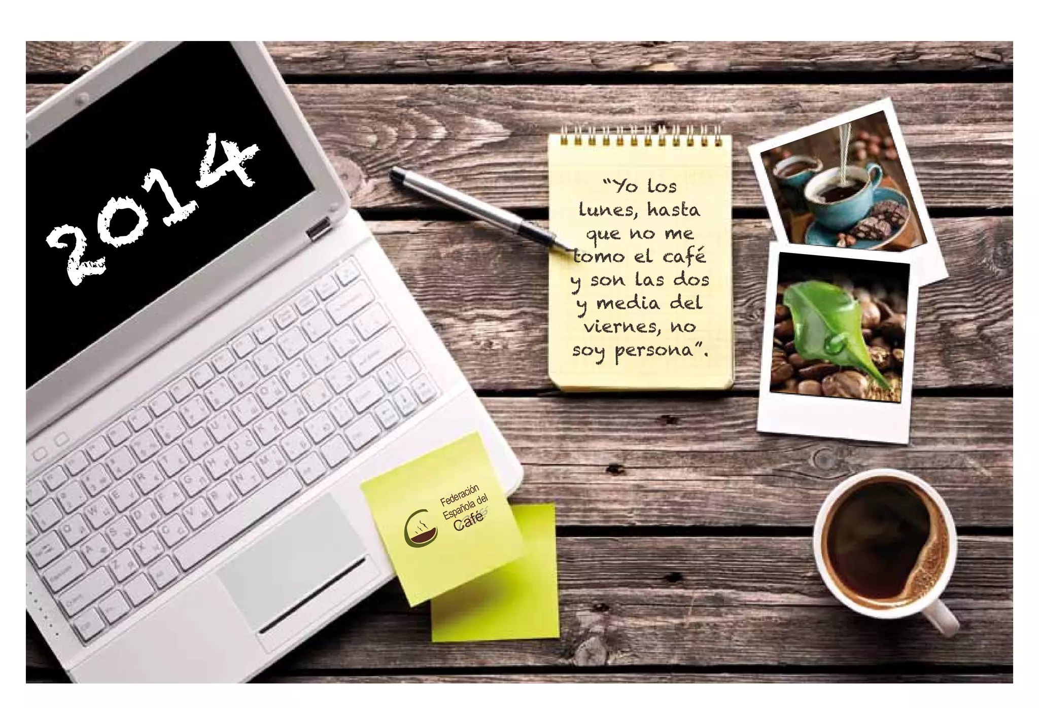 Este documento es un calendario de 2014 que contiene citas y frases sobre el café de diversos autores y personalidades a lo largo de la historia. Cada página presenta una cita diferente relacionada con el café, la amistad, la creatividad u otros temas, junto con los meses y días de 2014. El calendario promueve una apreciación por la cultura del café.