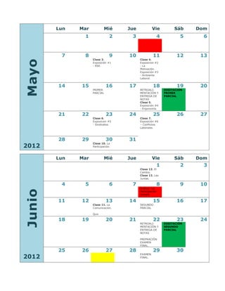 Este documento presenta el cronograma de actividades para una clase de 12 semanas. Incluye 13 clases con diferentes temas como relaciones humanas, comportamiento organizacional y cambio. También incluye exposiciones, tres exámenes parciales, un examen final y períodos para entregar trabajos y notas.