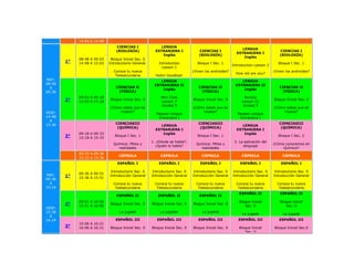 Este documento presenta el horario semanal de una escuela para la primera semana de agosto. La semana incluye clases de ciencias, historia, matemáticas e idiomas extranjeros como inglés para diferentes grados. Los temas de las clases varían cada día de la semana.