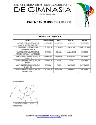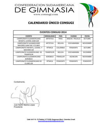 Este documento presenta el calendario de eventos de la Confederación Sudamericana de Gimnasia para 2014 y 2015. En 2014 se realizarán campeonatos sudamericanos de gimnasia artística, rítmica, trampolín y aeróbica en Perú, Bolivia, Colombia y Paraguay. En 2015, los campeonatos tendrán lugar en Argentina, Colombia, Bolivia, Paraguay, Perú, Chile y Panamá.