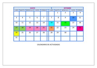 El documento presenta un calendario de actividades escolares mensual para el ciclo escolar. En él se detallan fechas importantes como inscripciones de alumnos, inicio y fin de cursos, reuniones de consejo técnico, evaluaciones bimestrales, concursos académicos, festividades y eventos culturales, así como periodos de vacaciones.