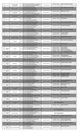 Este documento presenta una tabla con información sobre las clases magistrales de diferentes asignaturas de las carreras de Historia, Educación y Letras. En la tabla se detalla el código y nombre de la carrera, asignatura, curso, miembros de la comisión asesora, fecha y hora del sorteo para la clase magistral, fecha y hora de la clase magistral y los postulantes. La información cubre 20 asignaturas de diferentes cursos y carreras.