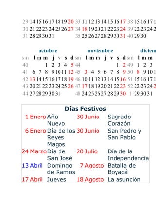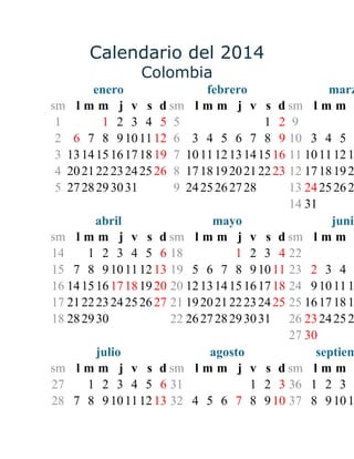 Este documento presenta el calendario del año 2014 para Colombia. Incluye los meses de enero a diciembre con los días de la semana y las fechas. También lista los días festivos del año con sus respectivas fechas.