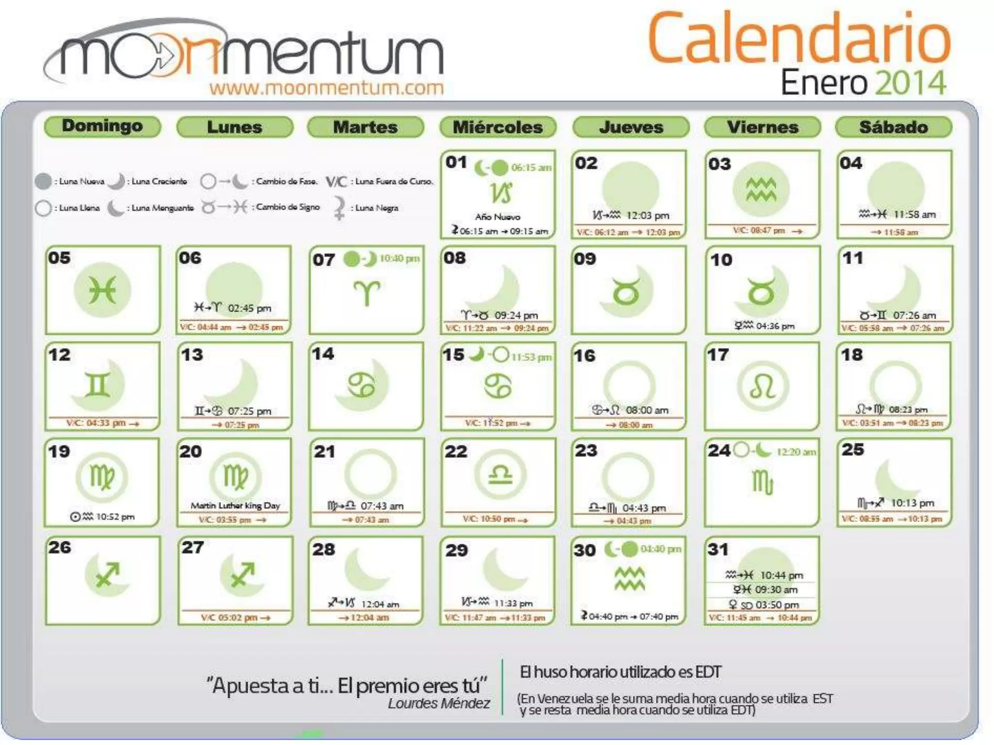 Este documento presenta información sobre las diferentes fases lunares, incluyendo cuarto menguante, luna nueva, cuarto creciente y luna llena. Proporciona las fechas y horas de inicio y finalización de cada fase, así como recomendaciones y energías asociadas a cada una. También incluye detalles sobre luna fuera de curso y la energía de Lilith.