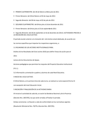 El documento presenta el calendario escolar para el año 2011 en Paraguay, incluyendo fechas clave como el inicio y fin del ciclo lectivo, fechas de exámenes y vacaciones, así como directrices sobre el desarrollo de actividades educativas y conmemoraciones patrias a lo largo del año.