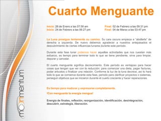 Este documento presenta información sobre las diferentes fases lunares, incluyendo el cuarto menguante, luna nueva, cuarto creciente y luna llena. También proporciona recomendaciones sobre actividades apropiadas para cada fase, así como detalles sobre la luna fuera de curso y la figura de Lilith en la mitología.