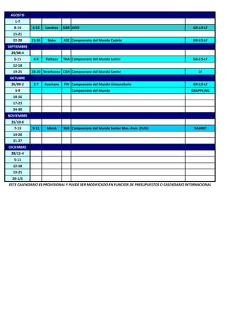 Este documento presenta el calendario provisional de competiciones de lucha para el año 2012, incluyendo campeonatos de España, Europa y del mundo en diferentes estilos (grecorromana, lucha olímpica, lucha libre, sambo) y categorías (senior, junior, cadete, escolar). Muchos de los eventos clasificatorios para los Juegos Olímpicos de Londres se llevarán a cabo en los primeros meses del año. El calendario está sujeto a posibles modificaciones.