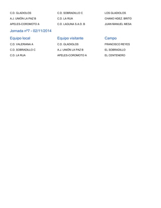 Este documento presenta el calendario de la primera fase de las jornadas infantiles, que incluye 7 jornadas jugadas entre el 21 de septiembre y el 2 de noviembre de 2014. En cada jornada se enfrentan 3 equipos en diferentes campos, indicando el equipo local, el visitante y el campo donde se jugará cada partido.