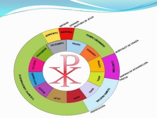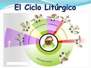 El documento describe el ciclo litúrgico católico, incluyendo las principales fiestas con fecha fija como Navidad y Epifanía, así como las que cambian de fecha cada año como Cuaresma y Semana Santa. Explica los períodos del Año Litúrgico como Adviento, Navidad, Cuaresma y Pascua, junto con los colores asociados y lo que se conmemora en cada uno.