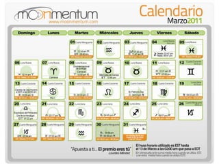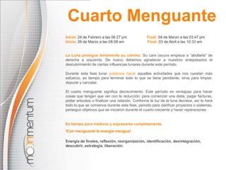 Este documento describe las diferentes fases lunares, incluyendo el cuarto menguante, luna nueva, cuarto creciente y luna llena. También proporciona información sobre los efectos asociados con cada fase lunar y recomendaciones sobre actividades apropiadas para cada período. Además, brinda detalles sobre conceptos como Mercurio retrógrado, equinoccios y Lilith.