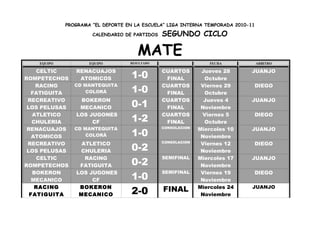 El documento presenta el calendario de partidos de la temporada 2010-11 del programa "El Deporte en la Escuela" para dos ciclos. En el primer ciclo se detallan 8 partidos de cuartos de final y semifinales entre 10 equipos, culminando con la final entre Racing y Fatiguita. En el segundo ciclo se programan 8 partidos de cuartos y semifinales entre 12 equipos, finalizando el ciclo con el partido entre Sporting Caradura y Pringaos United.