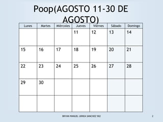 El documento presenta el calendario maya dividido en 20 períodos de 13 días cada uno, comenzando en agosto y finalizando en julio. Cada período se identifica con un glifo y se asocia a eventos astronómicos, agrícolas o naturales ocurridos durante ese lapso de tiempo.