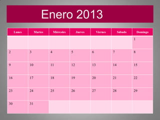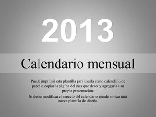 Este documento proporciona plantillas de calendario mensuales para 2013 que pueden imprimirse o agregarse a presentaciones. Incluye instrucciones para modificar el diseño de los calendarios aplicando nuevas plantillas.
