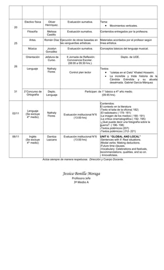 Este documento presenta el registro de actividades y evaluaciones del curso 3° medio A durante el mes de octubre de 2017. Contiene las asignaturas, profesores, fechas de evaluaciones y contenidos abordados. Se realizaron diversas evaluaciones institucionales y sumativas en materias como matemáticas, ciencias sociales, biología, física e inglés. También hubo jornadas de reflexión, concursos de ortografía y festivales. El valor del mes fue la honestidad.