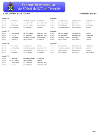 Este documento presenta el calendario de partidos de la primera fase de la temporada 2013-2014 para el grupo 4 de la categoría alevín. Se enumeran las 7 jornadas con los enfrentamientos de cada fecha entre los 8 equipos participantes: C.D. O F R A, AD CARDONAL- LAGUNA, A.J. UNIÓN LA PAZ, EMFC. LA BASILICA, EMF. AT.U. GUIMAR, C.D. EL TRANVIA, C.D. VERDELLADA y C.D. SOBRADILLO. Adicional