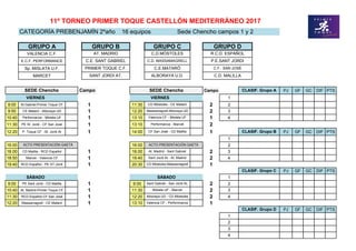 El documento detalla el 11º Torneo Primer Toque Castellón Mediterráneo 2017, que se llevó a cabo en el complejo deportivo Chencho, con varios equipos de fútbol en diferentes grupos y horarios de partidos. Se mencionan las clasificaciones y resultados esperados, así como la programación de la fase final y los eventos asociados como la inauguración y entrega de trofeos. Participan un total de 16 equipos en la categoría prebenjamín.