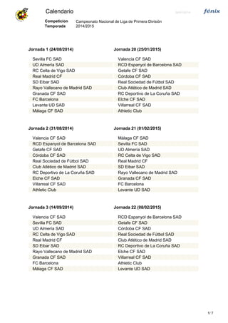 Este documento presenta el calendario de la temporada 2014/2015 de la Primera División de la Liga de España, con las 38 jornadas programadas y los equipos participantes. Se detallan los enfrentamientos de cada fecha, desde la jornada 1 el 24 de agosto de 2014 hasta la jornada 38 el 24 de mayo de 2015.