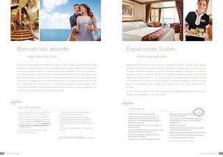 Este documento describe los servicios y características de lujo de los cruceros de Regent Seven Seas Cruises, incluyendo suites espaciosas con terraza privada, múltiples restaurantes gourmet, excursiones ilimitadas e incluidas en tierra, spa, gimnasio, y un servicio personalizado las 24 horas. Todo está incluido en el precio del crucero, desde los refrescos y las comidas hasta las propinas.