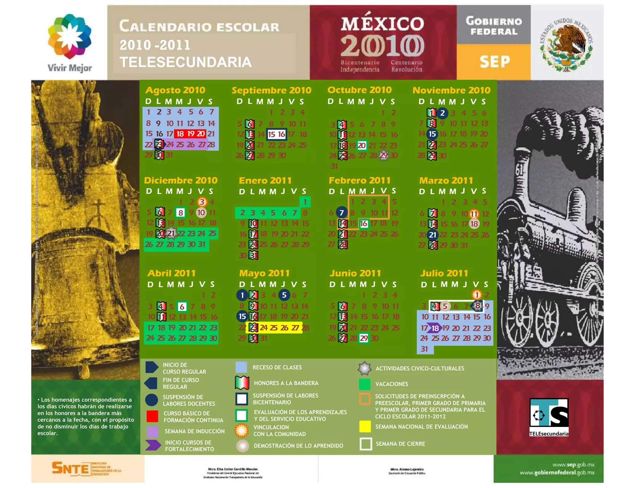 Este documento presenta el calendario escolar de 2010 a 2011 de una telesecundaria. Incluye los meses del año con las fechas, así como eventos importantes como inicio y fin de cursos, días festivos, evaluaciones, solicitudes de inscripción y más.