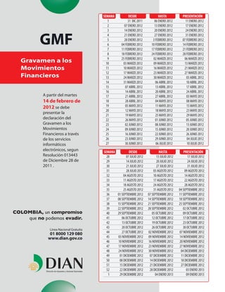Este documento presenta el calendario tributario para Colombia en 2012, incluyendo fechas límite para retención en la fuente, declaración y pago de impuestos sobre la renta e IVA para personas naturales y jurídicas, así como fechas para la declaración y pago de otros impuestos como al patrimonio y precios de transferencia. También incluye el calendario para la declaración del gravamen a los movimientos financieros.