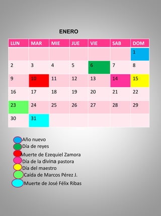 Este documento presenta un calendario anual que destaca fechas importantes en la historia y cultura de Venezuela. Incluye eventos como días festivos, batallas históricas, nacimientos y muertes de figuras notables. El calendario fue creado por una estudiante de psicología en la Universidad Bicentenaria de Aragua para su primer trimestre en la sección P1 en Valle de la Pascua.