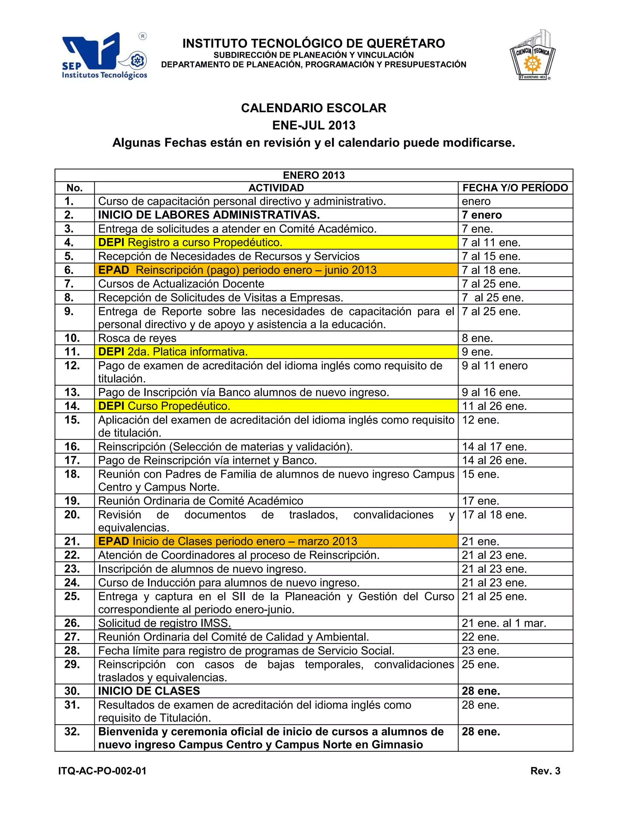 Este documento presenta el calendario escolar del Instituto Tecnológico de Querétaro para el periodo de enero a julio de 2013. Incluye 117 actividades académicas, administrativas y de vinculación agrupadas por mes e identificadas con un número y descripción breve. Las fechas están sujetas a posibles modificaciones.