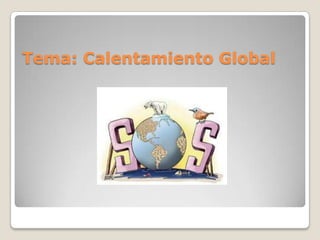 Este documento presenta información sobre el calentamiento global. Habla sobre los gases de efecto invernadero emitidos por humanos que causan el calentamiento, y los efectos como derretimiento de glaciares, aumento del nivel del mar e inundaciones. También menciona soluciones como usar energía de manera eficiente, reducir emisiones de vehículos y reciclar para proteger los bosques.
