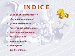 El documento habla sobre el calentamiento en educación física. Explica que el calentamiento consiste en ejercicios generales y específicos antes de una actividad para prevenir lesiones y preparar el cuerpo física y psicológicamente. Detalla los factores del calentamiento como la duración de 7-15 minutos, intensidad baja aumentando gradualmente, 5-8 repeticiones, y 1-3 minutos de pausa entre el calentamiento y la actividad principal. Finalmente, describe tipos de calentamiento como general, específico, estático, dinámico y