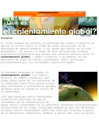 El documento resume los conceptos de calentamiento global y cambio climático. Explica que si bien el efecto invernadero es un fenómeno natural que mantiene la temperatura de la Tierra, los gases de efecto invernadero han aumentado rápidamente debido a la quema de combustibles fósiles y la deforestación, lo que está acelerando el calentamiento global y poniendo en riesgo el futuro de la humanidad.