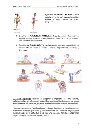 Este documento proporciona información sobre el calentamiento antes del ejercicio físico. Define el calentamiento, explica sus objetivos y efectos en el organismo, y describe las dos fases del calentamiento - general y específica - así como la importancia de volver a la calma después del ejercicio.