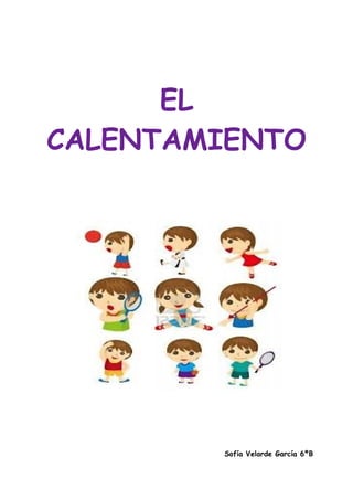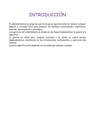 El documento trata sobre la importancia del calentamiento antes de realizar actividades físicas, destacando sus dos fases: general y específica. Explica los tipos de calentamiento y sus objetivos, formas e intensidades, enfatizando la necesidad de adaptarlo a las características individuales del deportista. Además, aborda factores como la edad, el tipo de deporte y las condiciones ambientales que pueden influir en el proceso de calentamiento.