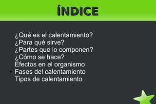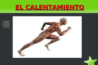 El documento describe los diferentes componentes y tipos de calentamiento. El calentamiento sirve para preparar el cuerpo para un mejor rendimiento físico y evitar lesiones. Consiste en calentamiento cardiovascular, muscular, estiramientos y movilidad articular. Existen calentamientos generales, específicos y mixtos.