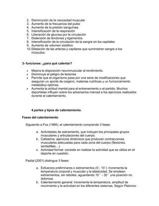 El documento define el calentamiento como la parte previa a la actividad física principal que prepara el cuerpo y la mente. Explica que el calentamiento mejora el rendimiento y reduce el riesgo de lesiones al aumentar la temperatura corporal, flexibilidad y circulación. También describe los diferentes tipos de calentamiento como general, específico, activo y pasivo, así como ejercicios comunes para cada parte del cuerpo.
