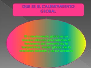 El documento trata sobre el calentamiento global. Explica que el calentamiento global se refiere al aumento de la temperatura promedio de la atmósfera y los océanos debido a las emisiones de gases de efecto invernadero. Estos gases están provocando alteraciones climáticas como el aumento del nivel del mar y fenómenos climáticos extremos. Originalmente, el efecto invernadero era un fenómeno natural que mantenía la temperatura de la Tierra, pero ahora las emisiones humanas lo están intensificando.