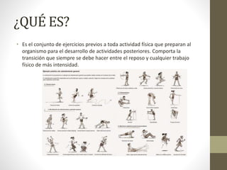 El documento explica que el calentamiento prepara el cuerpo para la actividad física subsecuente al aumentar gradualmente la temperatura muscular, mejorar la contracción y relajación muscular, y activar los sistemas muscular, nervioso y respiratorio. El calentamiento debe incluir ejercicios de movilidad articular, aumento de pulso y temperatura, estiramientos, y ejercicios generales con mayor intensidad para preparar completamente el cuerpo.