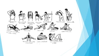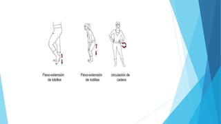 El calentamiento general consiste en realizar ejercicios que preparan el cuerpo para la actividad física posterior. Incluye desplazamientos, movimientos articulares, carreras y saltos para calentar la mayor cantidad de músculos posible. El calentamiento general se divide en cuatro fases: 1) ejercicios para elevar la temperatura muscular y la frecuencia cardíaca, 2) movilidad articular, 3) estiramientos y 4) ejercicios generales. Cada fase no debe durar más de unos minutos en un calentamiento de 6-
