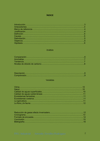 El documento presenta información sobre el calentamiento global, incluyendo sus causas, efectos y variables. Explica que el aumento de gases de efecto invernadero debido a la actividad humana ha causado un incremento en la temperatura promedio de la Tierra y los océanos. Algunas consecuencias incluyen el derretimiento del hielo polar, aumento del nivel del mar, y efectos negativos en la salud, agua, agricultura y ecosistemas.