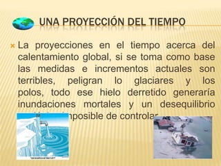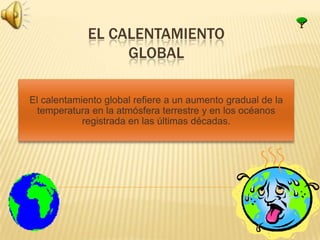 El documento trata sobre el calentamiento global. Explica que se refiere al aumento de la temperatura en la atmósfera y océanos registrado en décadas recientes y analiza sus posibles efectos como derretimiento de glaciares e inundaciones. También menciona que la tala descontrolada empeora la pérdida de biodiversidad y que la actividad humana desde la revolución industrial ha incrementado gases de efecto invernadero causando este calentamiento.