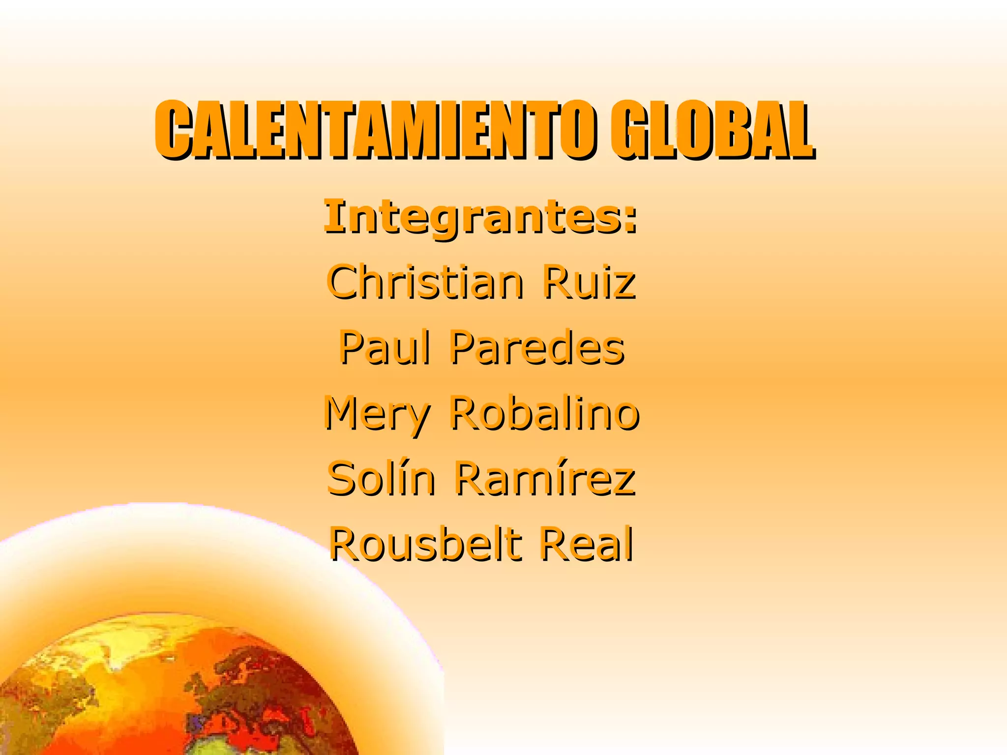El documento describe los efectos del calentamiento global causado por la acción humana, incluyendo el aumento de la temperatura entre 1.4°C y 5.8°C y el crecimiento del nivel del mar en 80 cm en los próximos 50 años. Explica cómo los gases de efecto invernadero atrapan el calor en la atmósfera y menciona algunos de los impactos como la subida del nivel del mar, cambios en los ecosistemas y alteraciones en el ciclo de producción de alimentos.