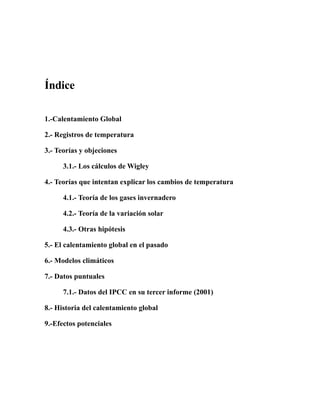 Este documento trata sobre el calentamiento global. Explica que el calentamiento global se refiere tanto al aumento observado de las temperaturas en las últimas décadas como a las teorías que predicen mayores temperaturas futuras. Explora las teorías sobre las causas del calentamiento, como los gases de efecto invernadero y la variación solar, así como los modelos climáticos, registros de temperatura e impactos potenciales del cambio climático. Finalmente, discute las objeciones y controversias en torno a las causas antropogénic