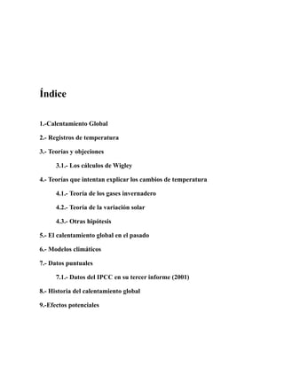Este documento discute el calentamiento global y presenta varias teorías para explicar los cambios de temperatura observados. Examina los registros de temperatura que muestran un aumento desde mediados del siglo XIX y analiza los modelos climáticos que predicen mayores aumentos de temperatura en el futuro si continúan las emisiones de gases de efecto invernadero. También explora las objeciones a la teoría del calentamiento antropogénico y las controversias en torno a este tema complejo con implicaciones económicas y políticas significativas