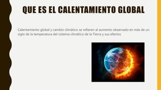 El calentamiento global se refiere al aumento de la temperatura del sistema climático de la Tierra y sus efectos, como el derretimiento de glaciares y el aumento del nivel del mar, mayormente causado por la actividad humana a través de emisiones de gases de efecto invernadero. Este fenómeno es resultado del efecto invernadero, que retiene el calor en la atmósfera. Para mitigar el calentamiento global, es fundamental adoptar medidas de conservación del medio ambiente.