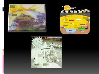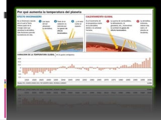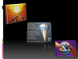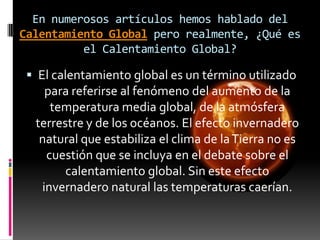 El calentamiento global se refiere al aumento de la temperatura promedio de la Tierra debido al efecto invernadero causado por los gases emitidos por la actividad humana. Los efectos incluyen el derretimiento del hielo ártico y el aumento del nivel del mar. La comunidad científica concuerda en que las emisiones humanas han intensificado el efecto invernadero natural y que para limitar el calentamiento global a menos de 2°C, debemos reducir las emisiones de CO2 a 350 partes por millón mediante el uso de energías renov