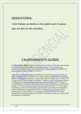 El documento habla sobre el calentamiento global y los gases de efecto invernadero. Explica que la mayoría de científicos aceptan que los seres humanos están contribuyendo al cambio climático a través de las emisiones de dióxido de carbono y otros gases. También discute diferentes puntos de vista políticos sobre cómo responder al problema y los esfuerzos internacionales para reducir las emisiones.