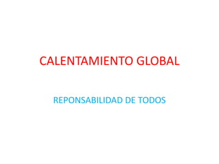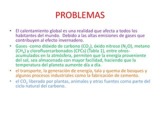 El documento describe los problemas del calentamiento global, incluyendo el aumento de los gases de efecto invernadero en la atmósfera y sus principales causas como el transporte, la generación de energía y la deforestación. También explica las consecuencias irreparables como el derretimiento de los glaciares, sequías, huracanes e inundaciones costeras. Finalmente, ofrece recomendaciones para evitarlo como reducir emisiones, usar energías renovables y plantar más árboles.