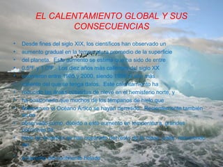 El documento describe el calentamiento global y sus consecuencias. Explica que la temperatura promedio de la Tierra ha aumentado entre 0.5°F y 1.0°F desde fines del siglo XIX debido al aumento de gases de efecto invernadero producidos por la actividad humana. Esto ha derretido el hielo polar y de glaciares, elevando el nivel del mar. Las consecuencias incluyen cambios en el clima, la agricultura, la flora y fauna. Se recomienda reducir el uso de combustibles fósiles y aumentar energ