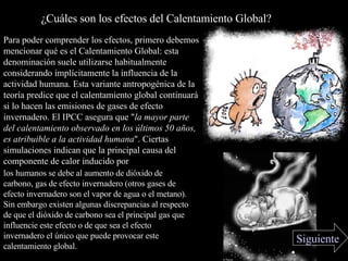 El documento describe los efectos del calentamiento global, incluyendo el aumento de la temperatura promedio de la Tierra debido a las emisiones humanas de gases de efecto invernadero como el dióxido de carbono. Esto puede provocar la disminución de la capa de nieve, la elevación del nivel del mar, y cambios en los patrones meteorológicos que amenazan especies y ecosistemas. Los datos muestran que la última década fue la más caliente registrada y que el calentamiento global podría extinguir hasta una cuarta parte