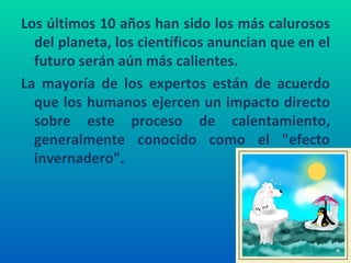 Los últimos 10 años han sido los más calientes registrados, y los expertos predicen que las temperaturas continuarán aumentando debido al efecto invernadero causado por los humanos, lo que provocará el derretimiento de los casquetes polares, la elevación del nivel del mar, la destrucción de bosques y la escasez de agua. Los ciudadanos pueden ayudar reduciendo el uso de vehículos, optando por alternativas como las bicicletas, y practicando el reciclaje y la conservación de recursos como el agua.