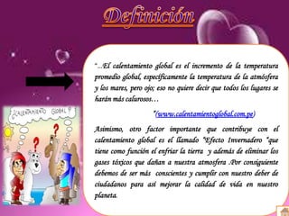 El documento define el calentamiento global y sus principales causas como el aumento de gases de efecto invernadero como el bióxido de carbono procedentes de la quema de combustibles fósiles y la deforestación. Explica que esto está provocando consecuencias como fenómenos climáticos más extremos, escasez de recursos y propagación de enfermedades. Finalmente, señala la importancia de que gobiernos, organizaciones y medios de comunicación colaboren en la difusión de medidas para contrarrestar este problema.