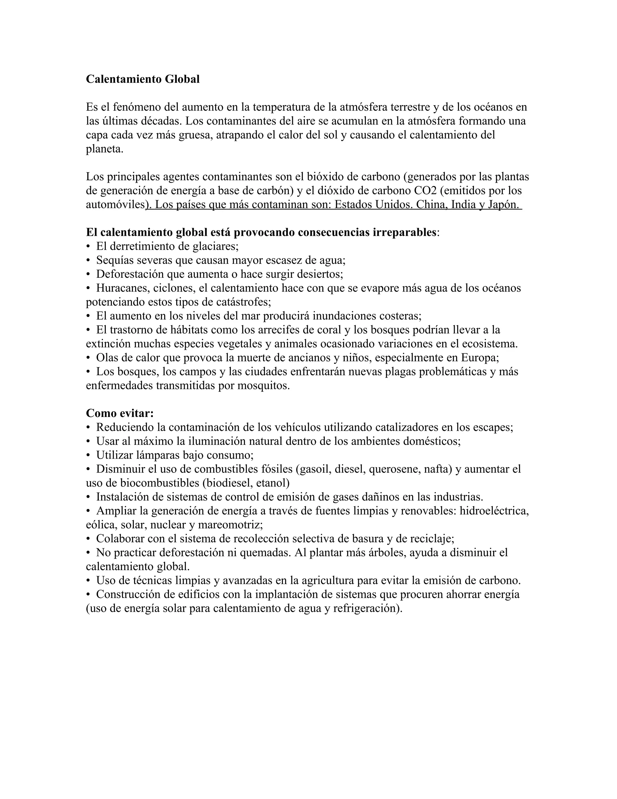 El calentamiento global se debe a que los contaminantes del aire se acumulan en la atmósfera formando una capa gruesa que atrapa el calor del sol. Las principales fuentes de contaminación son las plantas de energía a base de carbón y los automóviles, emitiendo grandes cantidades de dióxido de carbono cada año. El calentamiento global ya está causando efectos dañinos como derretimiento de glaciares, sequías, huracanes más intensos y aumento del nivel del mar.